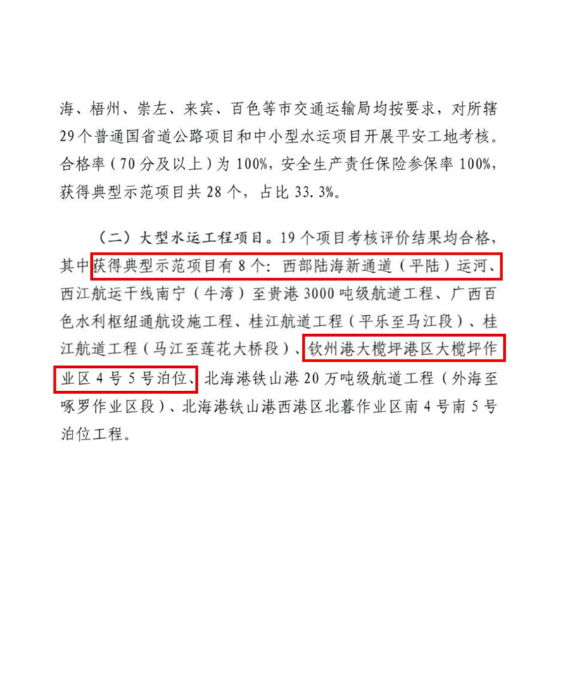 【公司喜报】 近日,广西自治区交通运输厅发布通报,我公司参建的西部陆海新通道(平陆)运河、钦州港大榄坪港区大榄坪作业区4#、5#泊位项目,双双荣获自治区“平安工地”示范项目称号。