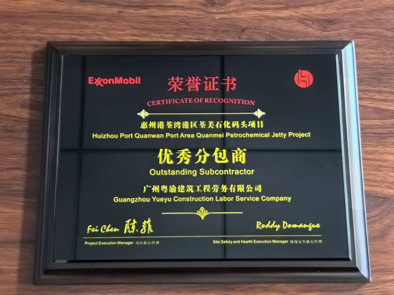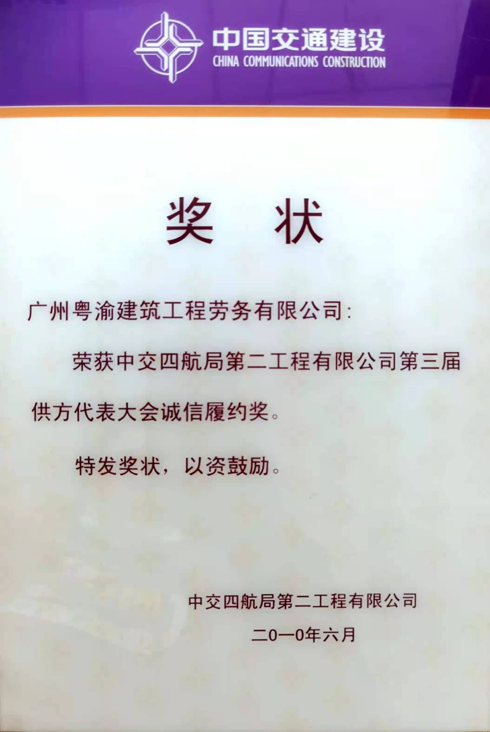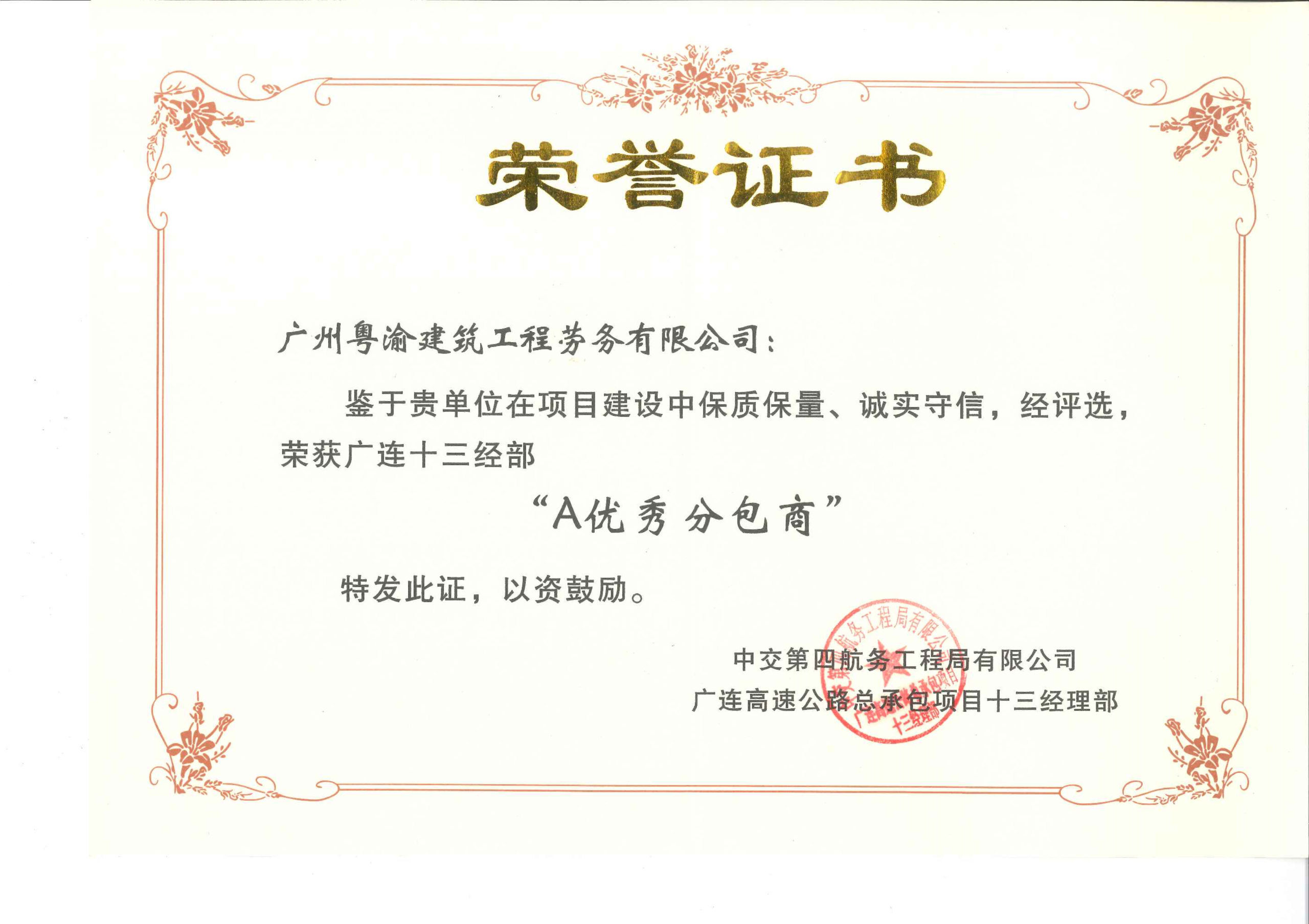 公司坚持“诚信兴业”经营理念,与国内多家大型建筑企业建立了长期战略合作关系。承接工程遍布国内外,工程验收合格率始终保持100%,多次荣获业主颁发的“诚信履约奖”、“优秀分包商”、“安全先进单位”、“质量管理优秀协作单位”、“优秀劳务队伍”等荣誉,连续多年被评为“广州市先进劳务企业”,是广州市建筑劳务行业协会第一届理事会会员单位。